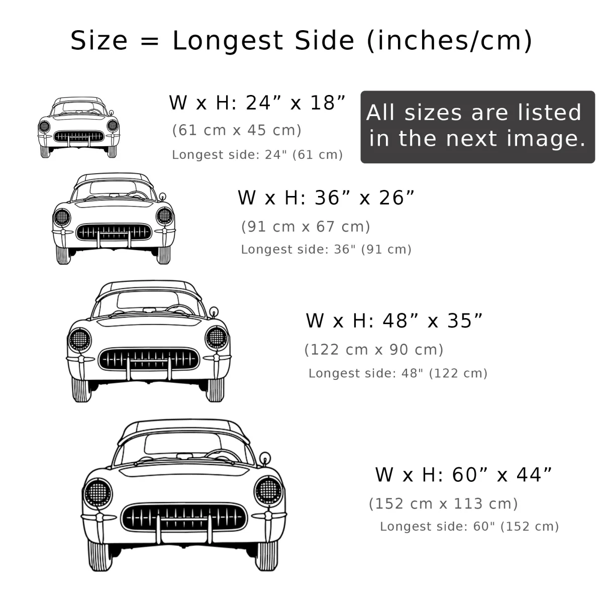 - 60″ x 44″ (152cm x 113cm): The ultimate statement piece, perfect for grand spaces and true Corvette aficionados.