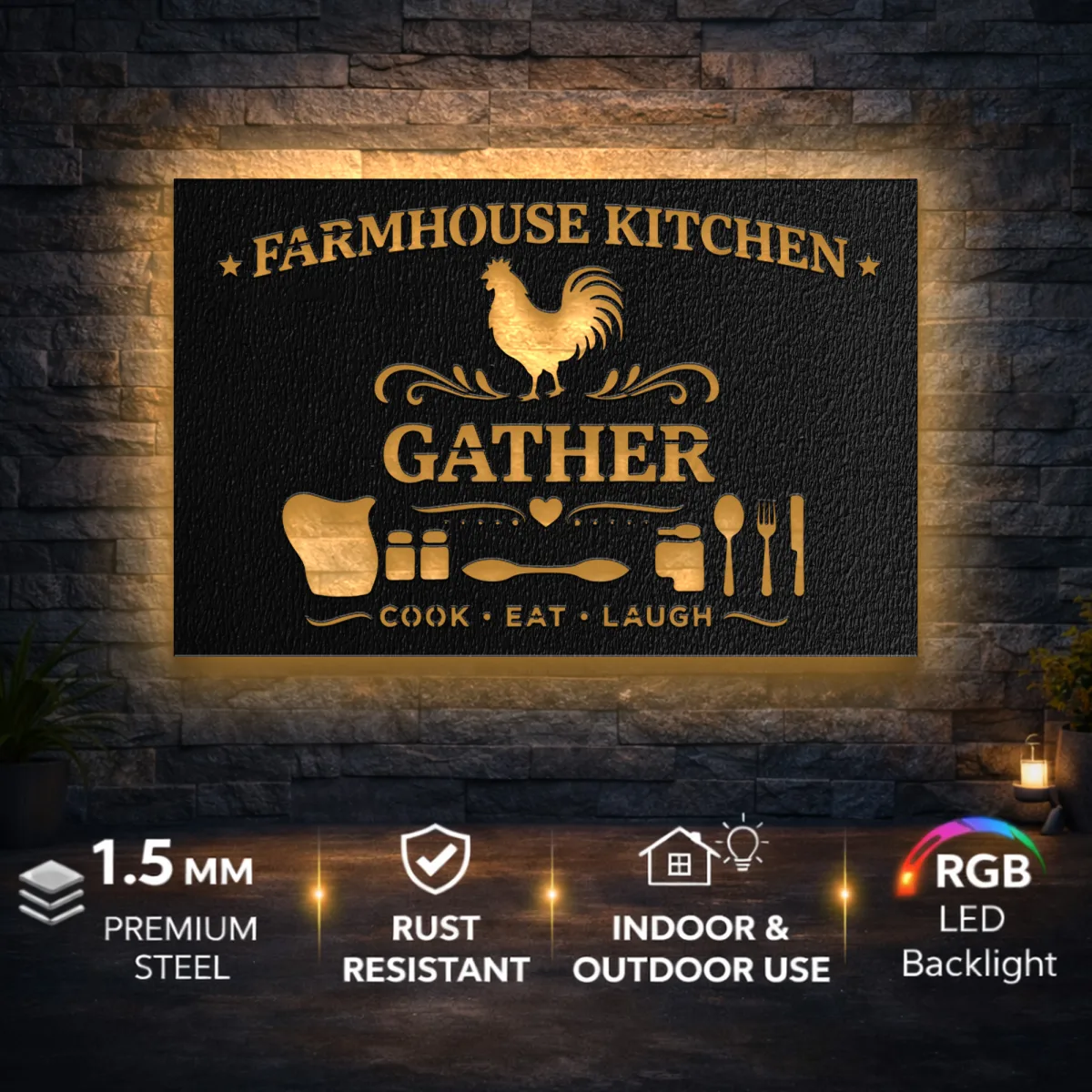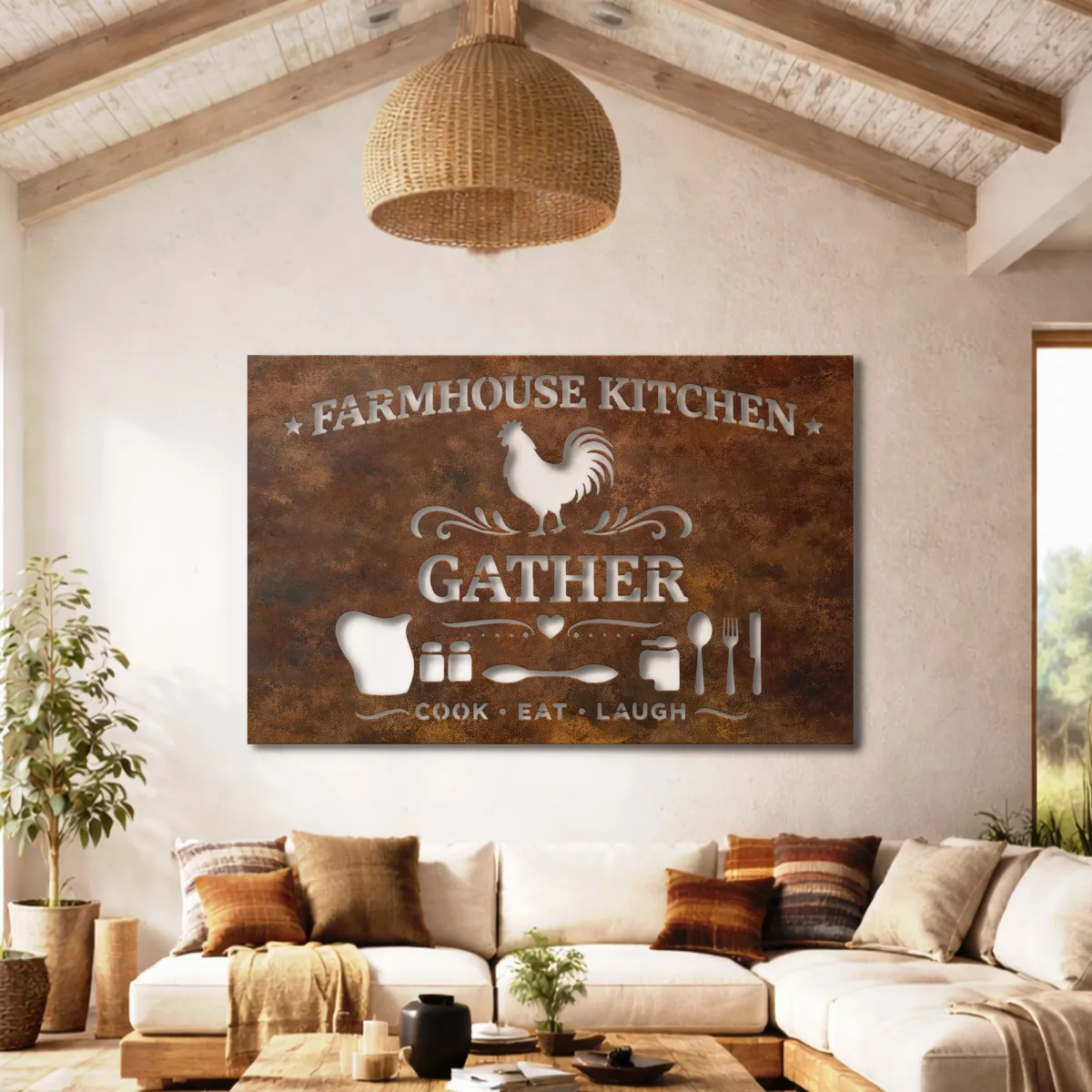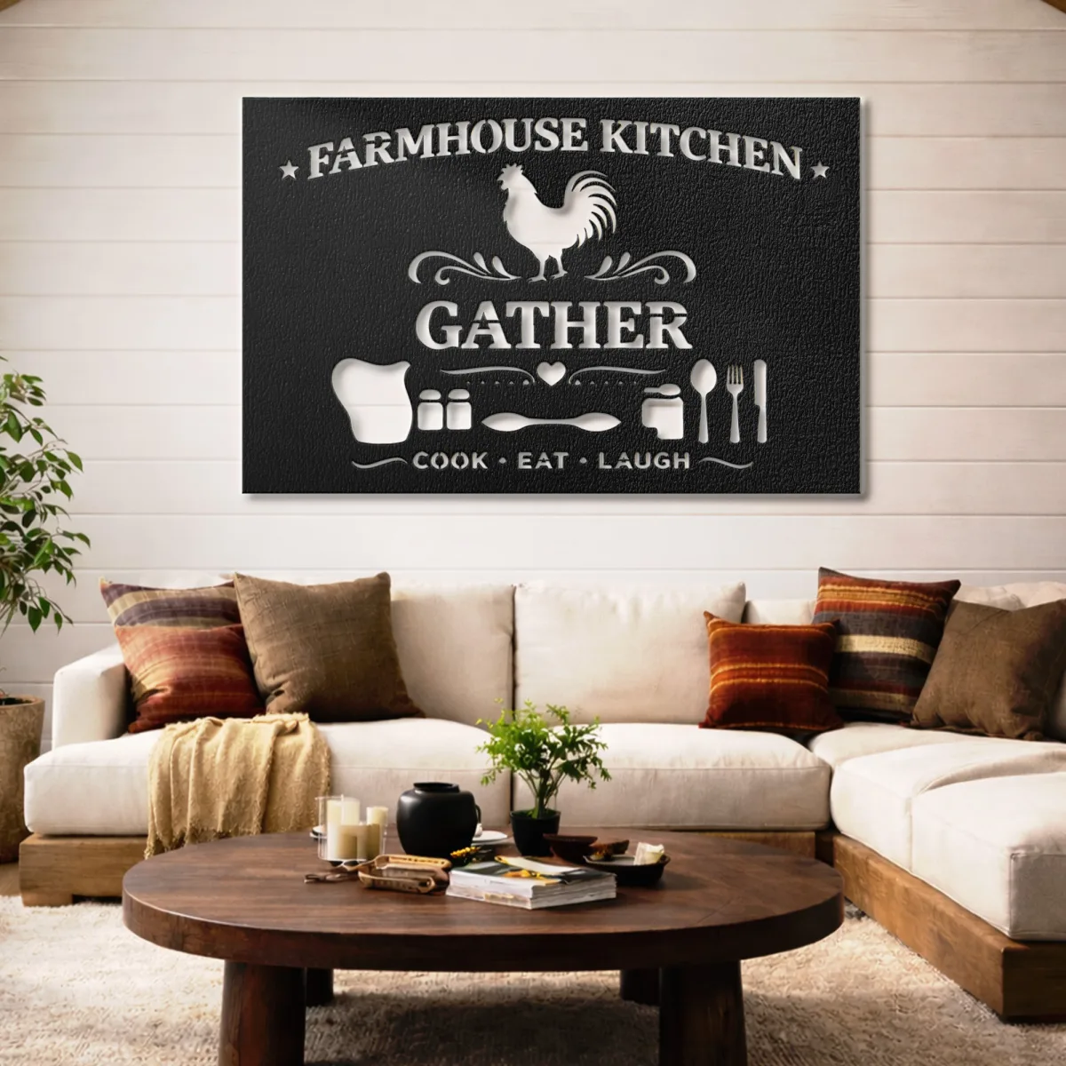 Elevate your home with our Farmhouse Kitchen Gather Metal Sign, a truly magnificent statement piece that transforms any wall into a focal point of warmth and hospitality. More than just decor, this oversized metal art embodies the heart of your home, inviting family and friends to gather, cook, eat, and laugh together.
