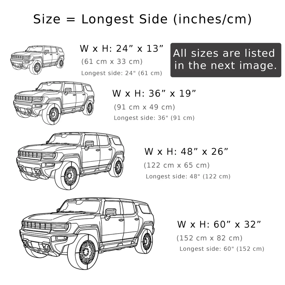 - ⚡️ Electric Icon Design: Captures the formidable silhouette of the GMC Hummer EV, celebrating its groundbreaking electric power and rugged luxury.
