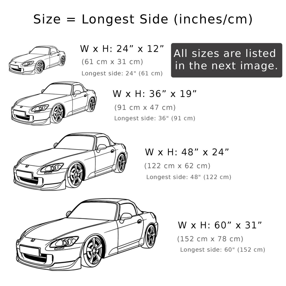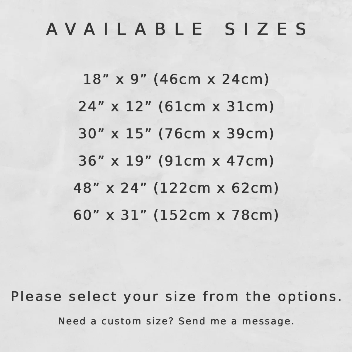18" x 9" (46cm x 24cm), 24" x 12" (61cm x 31cm), 30" x 15" (76cm x 39cm), 36" x 19" (91cm x 47cm), 48" x 24" (122cm x 62cm), 60" x 31" (152cm x 78cm)