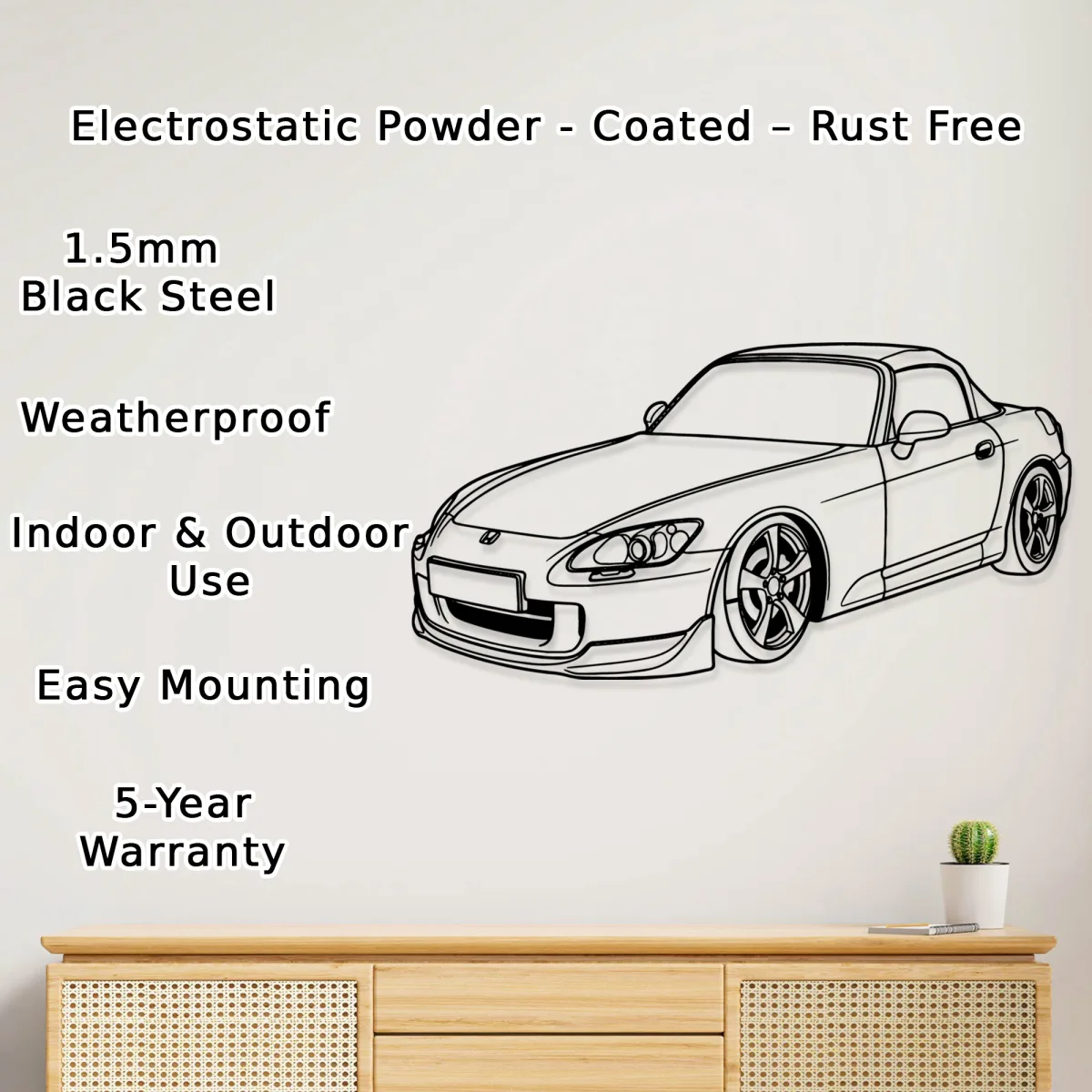 • 💎 Premium Craftsmanship: Meticulously laser-cut from durable 1.5mm steel, ensuring a sleek, detailed silhouette of the legendary Honda S2000.